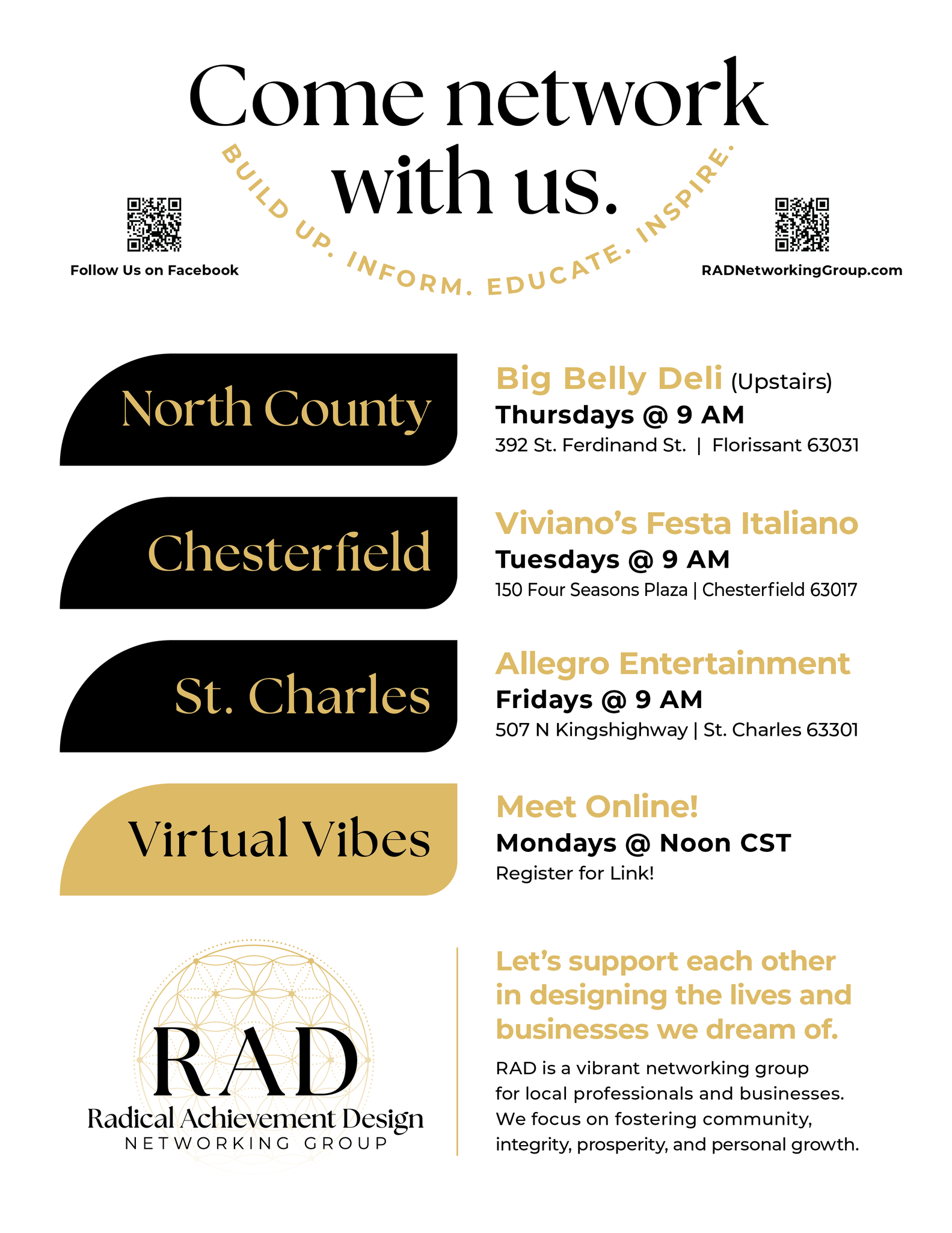 RAD (Radical Achievement Design) is more than a networking group—it’s a thriving community where professionals and businesses connect, grow, and thrive. With meetings in Chesterfield, Florissant, and St. Peters, RAD makes it easy to network and build lasting relationships in your area.